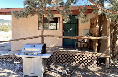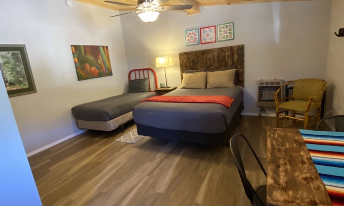 This unique newly remodeled one-room stucco casita is surrounded by the Gila Wilderness. This ADA unit contains one room with one queen-size bed and one twin-size bed and has a full-size ADA bathroom with a tub/shower combination. Your kitchen has a refrigerator, stove, microwave, and coffeepot. It comes equipped with dishes, pots and pans, coffee, cream and sugar, and a few basic spices. Your casita is tastefully furnished with artwork depicting the local area.