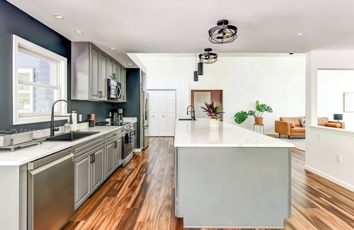 Upon arrival, you'll be greeted by a spectacular 15-foot island that serves as the centerpiece of the super modern, fully-equipped kitchen. This culinary haven is perfect for whipping up gourmet meals, hosting lively conversations, or enjoying casual breakfasts. With top-of-the-line appliances and ample space, it's designed to make every cooking experience a delight.
