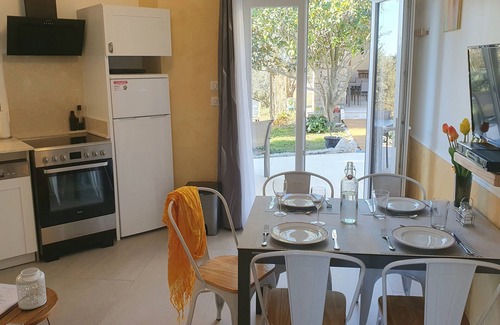 This charming Provencal cottage with an area of 55m2 has a suite with a double bed (160x200 cm) and its adjoining bathroom, and a second bedroom with double bed (160x200 cm), a bathroom water and a separate toilet. The living room has a comfortable sofa bed for 1 person (bed 120 × 200 cm) and a fitted American kitchen, fully equipped with a granite countertop. The private terrace is set up with its garden aluminum furniture.