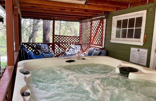 Amenities: Master Bedroom w/ King Bed, Guest Bedroom w/ Full Bed and On-Suite Bathroom w/ Shower/Tub Combo, Guest Bathroom w/ Shower/Tub Combo, Walk-Through Galley Kitchen, Wet Bar, New Hot Tub, 2 Living Rooms, Central Heat, Wood Burning Fireplace, Swamp Cooler, Wi-Fi, Propane Gas Grill, Streaming Capabilities, Washer/Dryer, Covered Front and Back Porch, Pet Friendly w/ Additional Fee.