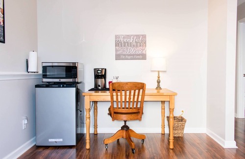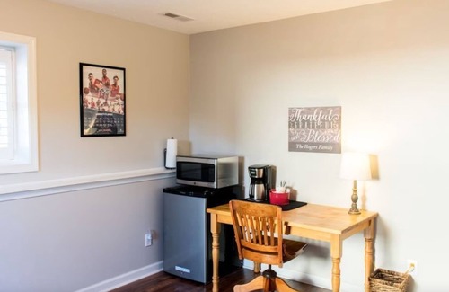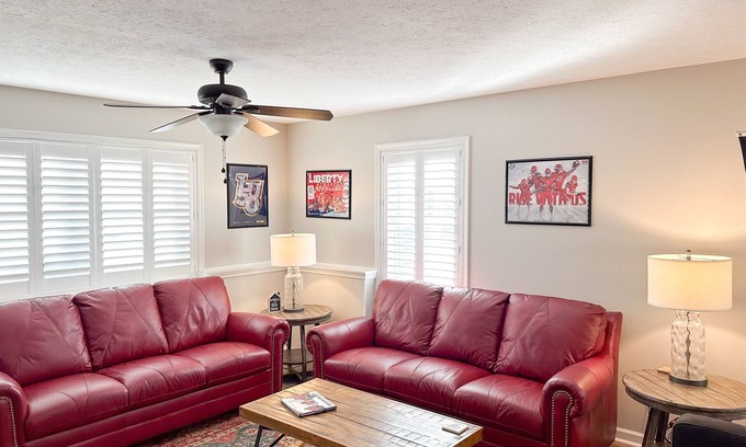 Your group will enjoy relaxing and hanging out in the spacious "Liberty University" themed family room (or "rec room") downstairs which is equipped with a 55" HD flat-screen TV and Blu-Ray DVD player and video library.