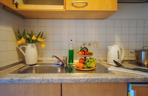 For all self-catering we have apartments with fully equipped pantry kitchen. The apartment has 1 living room, 1 bedroom, 1 pantry kitchen and 1 bathroom. All apartments with kitchen are very quiet and aligned to the garden side. Distribution (4 pers): 1 bedroom with double bed and LED TV, 1 living room with dining area and sitting area, sofa bed and LED TV, 1 bathroom with shower and toilet, 1 kitchenette kitchenSepartment (5 pers): 2 bedrooms with double bed and LED TV, 1 living room with dining area and sitting area, single bed or sofa bed and LED TV, 1 bathroom with shower and toilet, 1 kitchenette Kitchen: with coffee machine, kettle, toaster, 2-plate-cooker, fridge, dishes, dishcloth, dishwater Sleeping: 1 double bed 1 sofa bedInternet: Free Wi-Fi in the main house, which sleep up to 5 people, do not have Wi-Fi access as they are located in the attic in the attic. Practical: laundry on request in the house possible, breakfast can be booked. Good to know: 1x linen per stay included, 1x towels per stay included, hairdryer at the reception free of charge for hire, cots and extra beds are available, duvets in all rooms, on Request without feather duvet is possible, pets are not allowed, smoking is not allowed in the entire house, bike rental is possible in the apartments with kitchen, the kitchens are to be cleaned before departure. A final cleaning of the kitchen can be booked for 60,00 €. In case of disregard 60,00 € become due. The indicated price refers to an occupancy for up to 4 persons. The occupancy of 5 persons is possible on request.