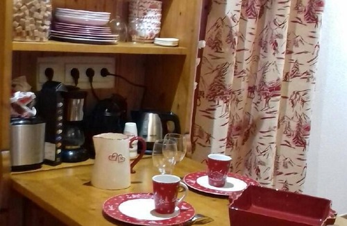 1 microwave, 1 traditional oven, induction hob, fondue and raclette, crepe maker, electric kettle, nespresso and traditional coffee maker, toaster, hairdryer, flat screen TV, canister vacuum cleaner and hand vacuum cleaner, ski, parking lot of the residence.