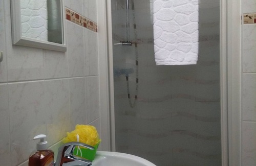 Bathroom, shower, bath towels provided.