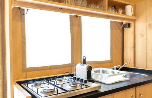 4-person glamping tent, stand-alone, single storey, smoke-free, in some accommodations pets are allowed, two bedrooms, one bathroom.