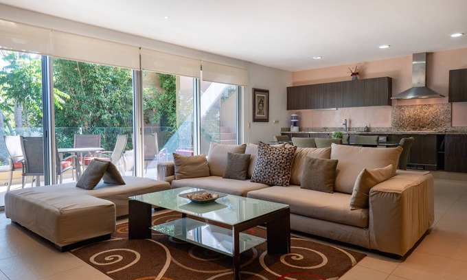 This penthouse features high-end finishes, including an open-plan layout with an abundance of natural light cascading through the floor-to-ceiling windows. With accommodations for up to six guests, you can enjoy two elegantly designed bedrooms, each equipped with en-suite bathrooms, along with a fully-equipped kitchen featuring Bosch appliances. The communal areas invite relaxation and celebration with indulging options such as 2 hot tubs, a cozy palapa space for gatherings, and a game room outfitted with entertainment options like ping pong and foosball. A personal ambassador from BRIC Vacation Rentals is dedicated to ensuring a seamless experience, offering additional perks such as cleaning services and welcome baskets.