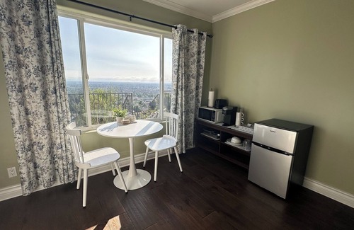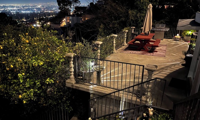This retreat features 4 suites, each with private bathrooms. Room 1 has a king bed and 60"TV. Room 2 has a jetted tub, king bed, large sofa bed, and a 70"TV. Room 3 has a full kitchen, queen bed, large sofa bed, small sofa bed, rollaway bed, and patio with BBQ grill and outdoor table. Room 4 has a queen bed and 65"TV. Includes 4 designated parking spaces. Exclusive use of laundry room, backyard is shared. Access to 3 rooms require walking downstairs, one room is at the top level (no stairs). Perched on a hill, this combination of suites offers sweeping views of LA County and a peaceful setting to unwind. Enjoy incredible sky views and sunsets. Conveniently located near top LA County attractions, you’ll have easy access to dining, entertainment, and outdoor adventures while enjoying a serene retreat above it all. Guests will also have access to the backyard, a space surrounded by lush greenery and trees, offering several distinct sitting and resting areas. The patio in the backyard has a BBQ grill and a wooden dining table, perfect for enjoying a meal and taking in the views. Laundry room is exclusive for guests, and parking area is shared. Please be mindful of our neighbors.