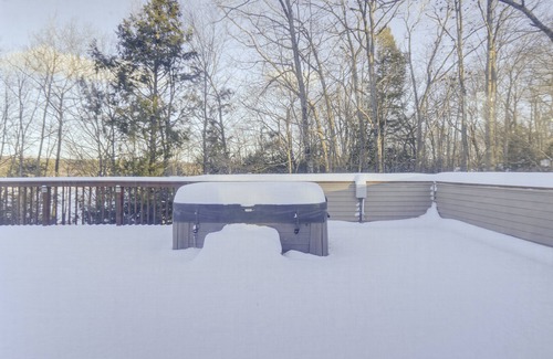 With beautiful views of Locke Lake, this 4-bed, 3.5-bath Barnstead home is the perfect winter escape! This vacation rental boasts multiple decks, a private hot tub, a boat dock, and a cozy fire pit by the water. When you’re not taking advantage of the outdoor amenities, stay warm indoors for a competitive game of ping-pong or gather by the fireplace!