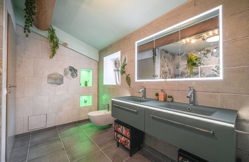 . a suite with a double bed of 140 x 190 and an adjoining bathroom with shower and toilet