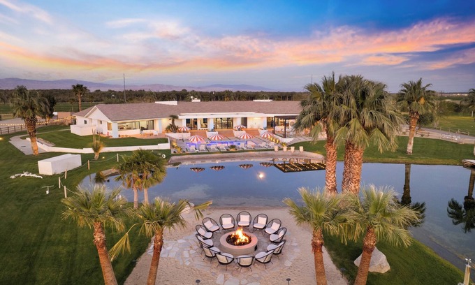 Located on 40+ acres of lush desert playground, Buena Vista is the ideal location for vacations and events alike. This 7,700 sqft 9-bedroom mid-century modern estate can sleep up to 20 people. Take advantage of the expansive freshwater lake, saloon-style wet bar, bonfire area, bocce ball, horseshoe rings, and al fresco dining area for your whole group. Venture inside, and you'll find an open floor plan connecting a beautifully designed living room with an impressive gallery wall, a spacious dining area and kitchen built for a chef, and an eclectic game room and wet bar. With so much to see and do both in and out of the home, there's never a dull moment at Buena Vista.