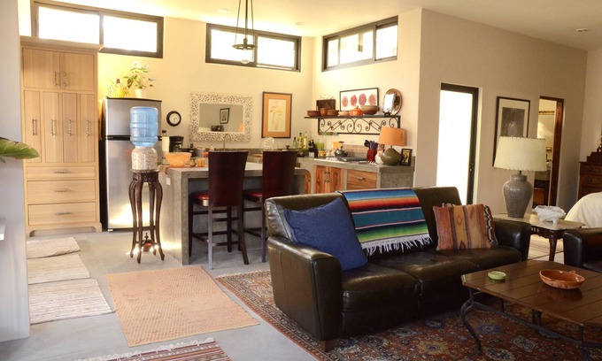 Both unites are 900 sq ft, and is a large open floor plan combining the kitchen, living room and dining room. Enjoy creating menus in fully equipped kitchens with an attached patio for BBQ-I got and dining. We invite people of both units to ascend the Talavera staircases to the rooftop. Sip your morning coffee there and watch the colorful lights of the morning sky, while the sun seemingly rises out of the depths of the Sea of Cortes. The views include Cerralvo Island and the Bay of La Ventana. At the end of the day, enjoy a margarita on the rooftop while feeling the heat of the setting sun sinking behind the mountains of the Cardon Desert. There is a special dusk-time, and then the sky changes star by star into the dark and brilliant Baja winter sky. From the unobstructed roof top of the building it feels like you can touch the stars.
