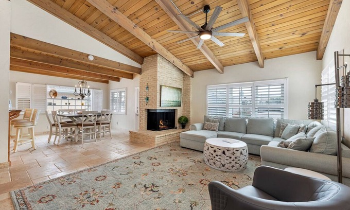 • Games, Movies and Fun by the Easy-to-Use Fireplace. After the sun sets, you can cozy up on the comfy couch near the remote-operated fireplace for movie night, board games, karaoke or charades—perfect for warming up and winding down after a day at the beach.