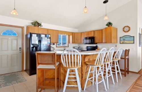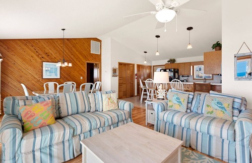 Pull up to this beautiful 3-Bedroom, 2-Bathroom home to know that oceanfront relaxation is here. With high ceilings and fantastic natural lighting, the Living Area is both beautiful and relaxing. A large Flat Screen TV sits in front of charming wooden paneling and is surrounded by lots of beachy, cozy furniture (including a Queen Sleeper Sofa) that makes this the perfect place for family movie night or an effortless afternoon catching up on your favorite beach read. Cook up some delicious seafood in the modern Kitchen and enjoy it together in the Dining Area, with table seating for 6, where you can enjoy your meal with spectacular views of the bright, blue waves of the Atlantic. There's also a Washer/Dryer in this home, so no more worrying about sand in those bathing suits.