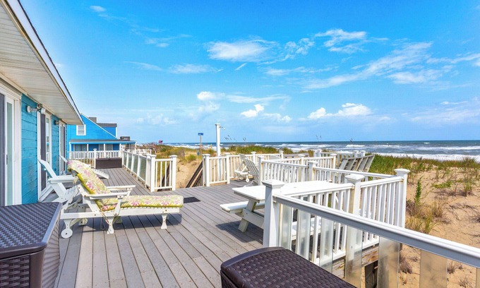 Beautifully decorated and cozy, The Pearl is an enticing oceanfront home in Kitty Hawk with breathtaking views of the ocean, a direct private walkway to the beach, and a sundeck with Adirondack furniture for taking in the scene. Take one step off the deck and you'll be able to feel the sand between your toes, at this sunny oceanfront retreat. Located in the heart of Kitty Hawk, you'll find many restaurants, attractions, and shopping just a walk away - One of the best values on the oceanfront!