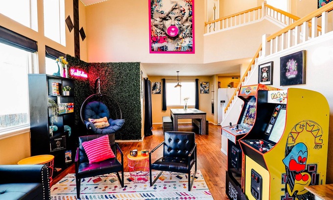 KushKations Elevation is a beautiful, 420-friendly home with 5 bedrooms and 3½ bathrooms, located just 20 minutes from downtown Denver and Red Rocks Amphitheatre! This vibrant, two-story home offers ample seating, multiple rooms, and plenty of amenities to entertain your group. Enjoy the game room and dining area, a 6-seater theater room, various board games in the living area, arcade games, and more!