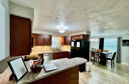 When you walk in you are greeted by an open concept floor plan which features a living room with a sectional couch and Roku TV, a fully-equipped kitchen with a Keurig, and a dining room with comfortable seating for eight (8).