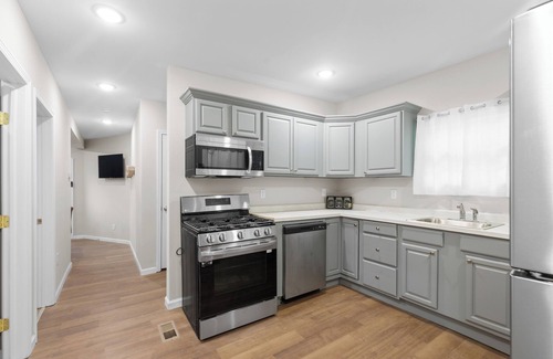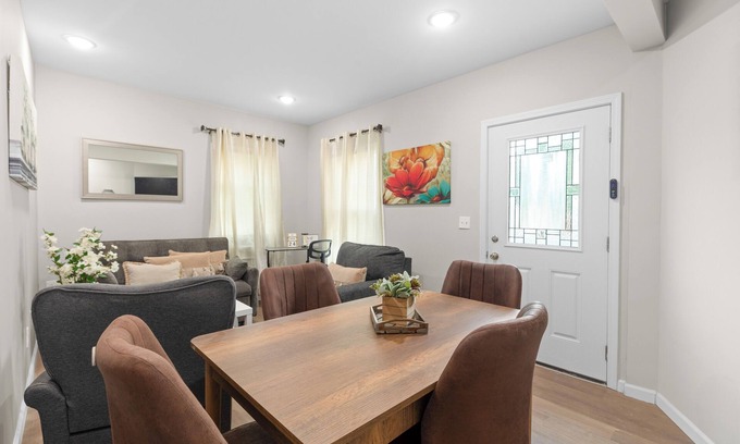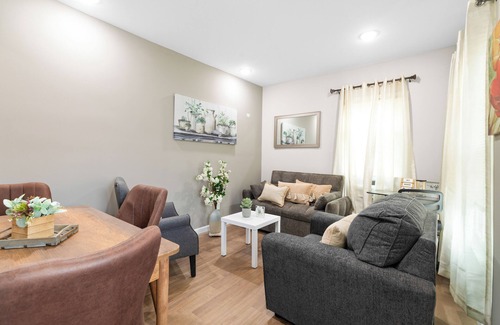 In the quiet and pleasant neighborhood, you can lounge with friends and family in this cute apartment with a comforting combination of a greyscale and pastel earthtone aesthetic throughout filled with all your needs during your stay.