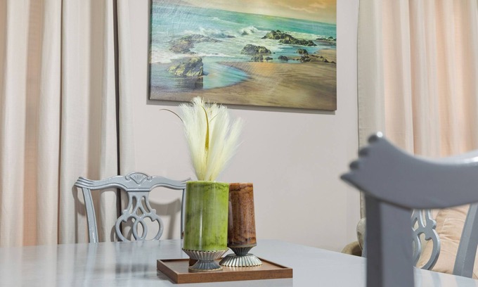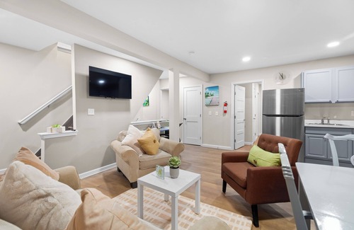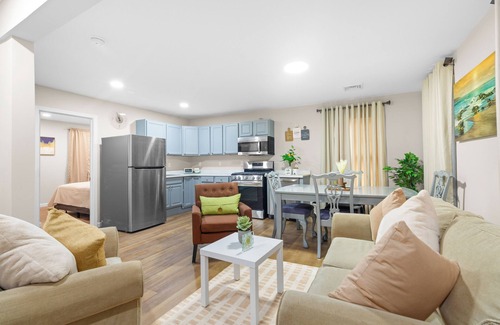 While being in this lovely and quiet neighborhood, you can relax and settle down with your friends and family in this cute greyscale apartment with hints of pastel earth toned decor throughout and filled with all your needs during your stay.