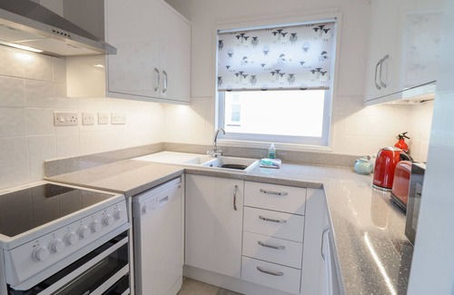 Amenities: Electric central heating. Electric oven and hob, microwave, fridge with icebox and dishwasher. TV, DVD Player and WiFi. Fuel and power inc. rent. Bed linen and towels inc. in rent. Communal parking area opposite bungalow. Front lawn. Enclosed back garden with lawn and patio. One well-behaved dog welcome. Sorry, no smoking. Shop 0.3 miles, pub 0.4 miles, beach 0.5 miles. Please note: This property only accepts 7 night bookings.