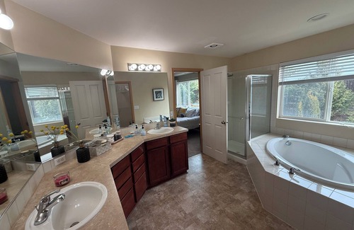 Spacious 4 bedroom home, ideal for corporate groups, families, and event travelers! 11 min to Good Sam Hospital, 9 min to WA State Fairgrounds, 12 min to Tacoma Waterfront, 10 min to Tacoma Dome, 37 min to Pike Pl Mkt, and 54 min to Mt Rainier. Sleeps 12 guests, 4 King beds, 2 Queen sofa sleepers, high-speed WiFi, smart TVs, fully equipped kitchen, and workspace. Perfect for work, leisure, offering comfort and convenience for your stay. 24/7 security monitoring, fenced in backyard, W/D, wlk trls