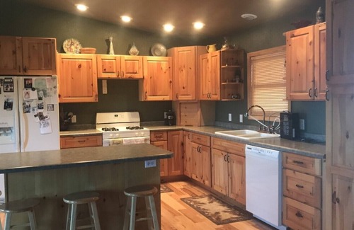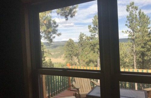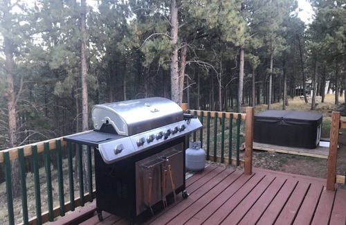 You will be enjoying a peaceful 4 bedroom home nestled in the woods with a gorgeous mountain view from inside the house or out on one of the two decks. Enjoy your stay by creating wonderful memories with people you love. Read a good book, play games, observe the creatures, watch the beautiful sunsets and be awed by the amazing stars. You can relax after a day of touring the beautiful Black Hills by soaking in the hot tub. You will be preparing your families favorite foods on the barbeque and in a fully equipped kitchen. End your day unwinding around the gas firepit telling stories and filling the night with laughter .