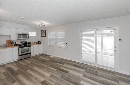 The open-concept kitchen, living, and dining area is designed for easy flow and socializing. While the kitchen is equipped with minimal cookware and silverware, larger groups or guests staying for extended periods are encouraged to bring additional supplies. Ten towels are provided across the bathrooms, so guests staying for more than one night should bring extra towels and washcloths or make use of the in-unit washer and dryer.
