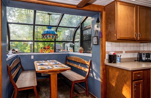 The breakfast bar and the glass dinning gazebo provide ample seating for 10. The kitchen is very generously stocked with all the necessary appliances and then some! Enjoy breakfast outdoors on the patio. There is a unique half bath and laundry room on this level as well. Check out the Living/Game Room on the next level. The unique Geode Gas Fireplace warms and cheers the activities that include pool, Wii games, cards at the bar height table. Maybe enjoy one of the 100+ books curled up on the window seat. In the surrounding Window Room there is basketball and foosball to challenge you. A large deck is off the window room that is a couple steps from the hot tub and play set. The Red Bedroom is on this level with its red bath, queen bed and flat screen with satellite. The Log Bedroom with several walls of the original logs, also boasts a private bath and queen bed. Both of these bedrooms have access to a small deck for viewing the morning bird and animal activity.