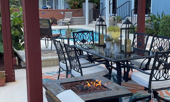 Now, let’s talk about the outdoor paradise that awaits you! The beautifully landscaped backyard features a heated pool, Tiki bar, fire pits, and a pergola for shaded relaxation. The Tiki bar includes a margarita machine, mini freezer/refrigerator, sink and even a popcorn popper for those movie nights under the stars. Plus, a large grill, outdoor TV and outdoor screen with a projector to enhance your island experience!