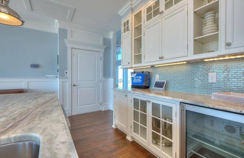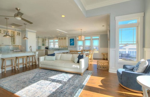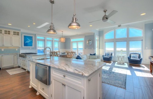 All Inn - This majestic oceanfront home is not only gorgeous on the inside but also offers the most stunning and endless panoramic ocean views! Get ready to experience the most amazing sunrises and sunsets as you enjoy your morning coffee on one of the oceanfront covered porches or sun decks, listening to the waves roll onto the shore and the pelicans and seagulls call as they fly overhead. There is just nothing else like it. This magnificent home features everything, and even some things you didn't even know you wanted. The cooking lover among you will absolutely be in heaven with the spacious gourmet chef's kitchen that features a Jen-Air gas stove, oven, convection microwave, island prep space, and even a separate wet bar area with additional refrigerator. Everyone can enjoy each other with the open concept layout, as well as the reverse floor plan with huge floor-to-ceiling windows that offer expansive ocean views from the top of the home. The second family room downstairs is a perfect getaway for the kiddos. This home is so wonderful you may never leave it while you are here, but if you do want to venture out, there are plenty of things to do, from sky diving to relaxing by one of the many bodies of water Oak Island has to offer. The beach is just steps from the house, so you can spend all day in the sun and sand and not have to go very far. This home also makes a great venue for weddings, reunions, and birthday/anniversary parties (additional fee for events). Make your reservation today! Once you are here, you will be All Inn and wanting to stay forever!
