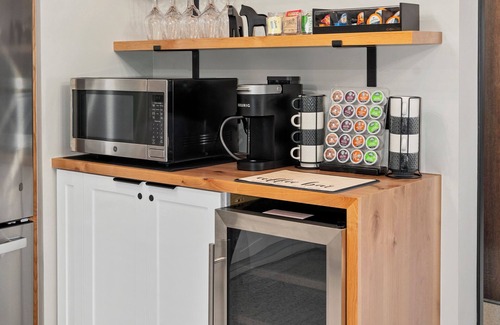- The kitchen has a dishwasher, electric oven/stove with air fry feature, microwave, standard refrigerator/freezer with ice maker, toaster, wine/beverage fridge, Keurig, tea kettle