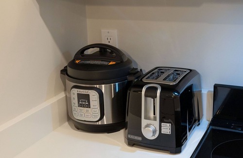 - Fully equipped kitchen with pots/pans, kitchen knives, basic condiments, bakeware, dinnerware, coffee mugs, cooking utensils, measuring cups, coffee machine, toaster, kettle, microwave, coffee, tea, and more!