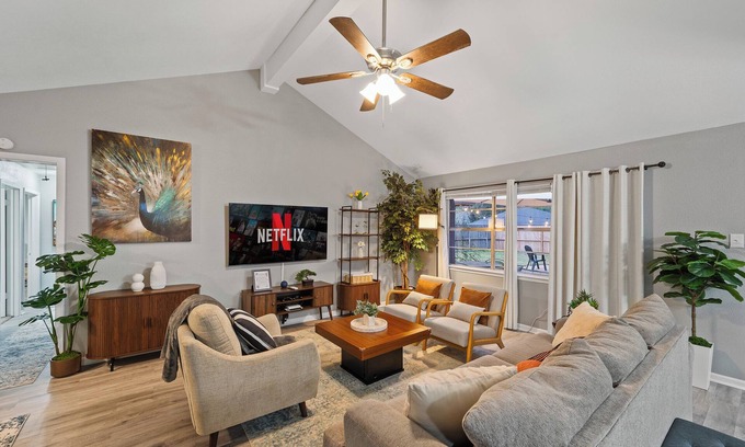 Relax in this peaceful, modern 4BR home just 3 miles from IAH & 21 from downtown. Perfect for families or business travelers—enjoy a full kitchen, smart TV, Nintendo Switch, cozy firepit, charcoal grill, spacious backyard, central AC, comfy beds, and easy self-check-in.