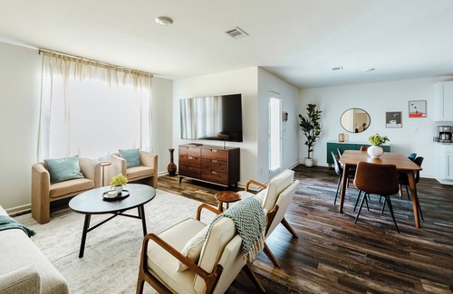 Our cozy, design-forward living room features a large smart TV, perfect for movie nights or game day streaming. Sink into the stylish sofa (Crate & Barrel) and enjoy plush throw pillows, soft blankets, and natural light pouring in through the windows. The open floor plan seamlessly connects the living, dining, and kitchen areas—perfect for families or groups who want to stay connected while relaxing in style.