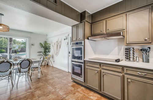 Your comfort and enjoyment are prioritized with a variety of amenities at this stunning property. Inside, you'll find four beautifully decorated bedrooms, including a bunk room designed for the little ones, all equipped with quality mattresses to ensure restful nights. The expansive living area invites cozy moments together, boasting a wrap-around sectional sofa and a 55” Smart TV for movie nights. The fully-equipped kitchen ensures that culinary needs are met, offering stainless steel appliances, a spice rack, and a dedicated coffee bar, perfect for hosting delightful meals with your closest friends and family. Outdoor dining is a breeze with a teak table overlooking the sparkling pool, providing the ideal setting for alfresco celebrations.