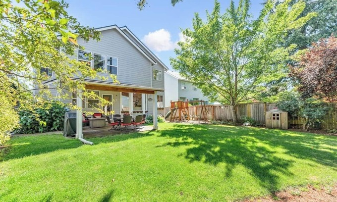 This 4-bedroom, 2.5-bath home is perfect for families and groups, featuring a spacious open-concept design with a gourmet kitchen, large island, and inviting living spaces. Outside, enjoy a covered patio with a fire pit, BBQ grill, and a kid-friendly backyard with a play area. Located near top restaurants, parks, and the Columbia River, this home offers the ideal mix of comfort and convenience.