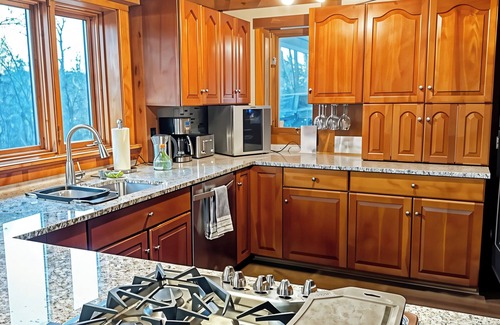 - Fully-stocked kitchen with hot water kettle, toaster, coffee maker and coffee pods, pots, pans, bowls, plates, glasses and utensils