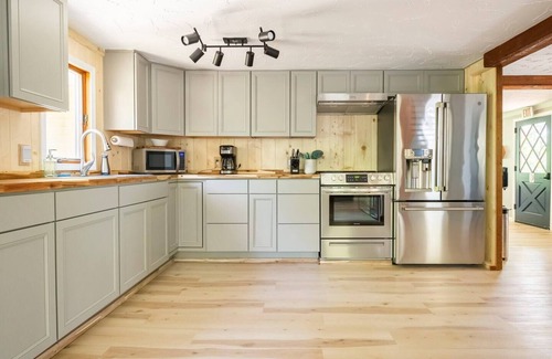 The cabin was fully renovated in April of 2023 and features a brand new kitchen with stainless steel appliances, butcher block counters, stainless cookware, dishes, utensils and small appliances as well as a kitchen and 2 stone fireplaces.