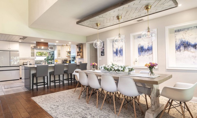 Your family will be close to everything when you stay at this centrally-located piece of paradise. Enjoy our outside amenities that include a fire pit, outdoor movie theater, heated pool & more! Inside you’ll find plenty of space to allow for guests to spread out or a fun dinner all together. When guests are not renting the guest house in addition to the main house, we will be on site and available to take care of any questions or requests you may have. Planning an event? Let us help!