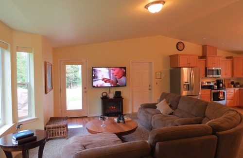 The house features: spacious vaulted great room with living room (multiple reclining sectional), dining area (seats 6), and kitchen with new stainless steel appliances (also microwave, coffee maker, bagel toaster, Belgian waffle maker, popcorn popper); 2 large bedrooms with queen size beds (luxurious cotton sateen sheets and down comforters), additional convertible queen bed; 2 full bathrooms with showers, tubs (luxury towels, soap, shampoo, and conditioner, hair dryer provided); utility room with washer and dryer (soap and fabric softener provided); iron and board; wood deck with patio dining set and gas grill; covered porches.