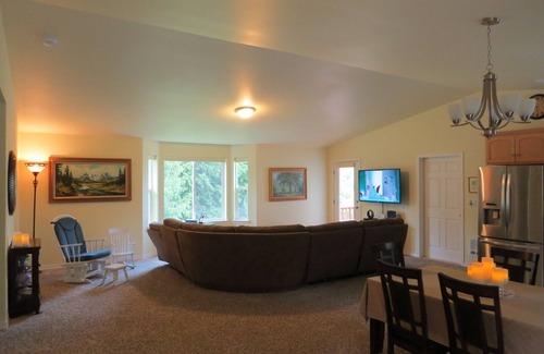 Welcome to peaceful Birdsong Retreat where the quiet serenity is accompanied with birdsong. This spacious, newly built home sits in a sunny yard on 5 acres of beautiful Cedar trees that guests are welcome to enjoy walking in. It is located at the end of a quiet road, very private, yet close to town and amenities - only 10 minutes from the car ferry, and less than 2 miles to the beach and a view of the Olympic Mountains.