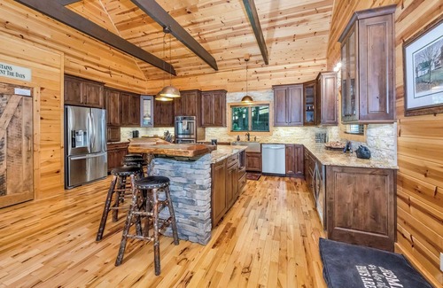 - Main level: Vaulted beamed ceilings and a glossy wooden interior give this cabin a forest-themed aesthetic. Curl up around the floor-to-ceiling stone fireplace on chilly nights. An open floor plan joins together the living, dining, and kitchen areas, and trust us, you're going to want to see this kitchen.