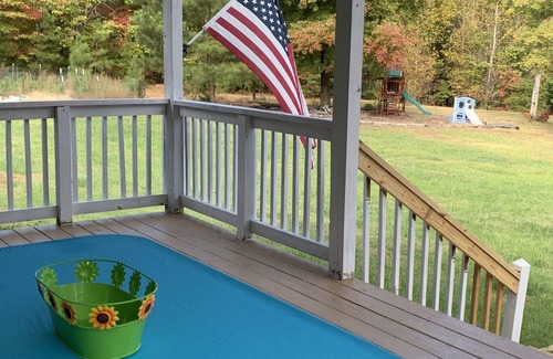 Very secluded 3 plus acres with a covered porch, in the front. Then there is also a nice open deck in the back. There is a shaded playground. Fire pit and horse shoe pit.