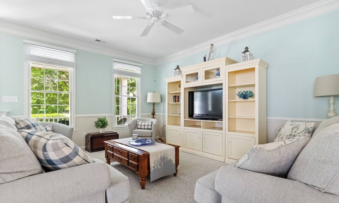 The community itself is a haven of amenities, including indoor and outdoor pools, a game room, clubhouse, gym, tennis, basketball courts, and a fishing, crabbing, and kayaking pier. With fresh renovations and stylish furnishings, the house is a welcoming space for your family or group getaway to the Maryland beaches. Enjoy outdoor relaxation with an outdoor grill and fire pit, along with smart streaming TVs, free WiFi, and ample parking for up to four vehicles in the driveway.
