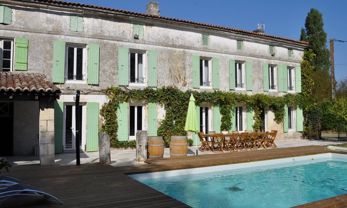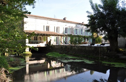 In the heart of the Charentais vineyards, an old mill from the end of the 18th entirely renovated with a heated swimming pool. Quiet on the edge of a small village, by the river and only 4 km from Pons, close to Cognac, Bordeaux, Royan, La Rochelle ... All bedrooms are equipped with cupboards, queen size beds, televisions. Satin sheets and towels are provided. The fully equipped kitchen with 2 fridges, 2 dishwashers, 2 ovens and a large cooking piano.