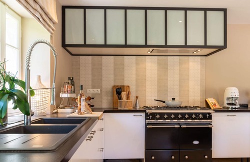 * The Kitchen: is very large and very well equipped with excellent quality crockery and kitchen equipment. There is also a large kitchen table running the length of the kitchen that can seat 10. The kitchen has a door to the garden ideal for serving lunch alfresco on the outside dining terrace.