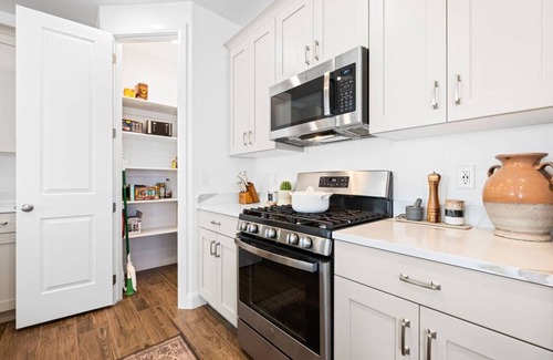 The main floor features an open concept kitchen and living room that extends into the dining area. The kitchen is fully stocked with everything needed to prepare meals for your friends and family, or to simply kick back and enjoy some great takeout. The dining area is furnished with a large dining table with seating for 7. The large kitchen island also offers additional seating for 4. Two laundry rooms, one on the main and another on the second floor, come stocked with all the supplies you will need during your stay. The main floor living room has ample seating with a large flat screen smart TV.