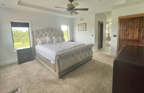Enjoy six acres of country living with our custom, mid-century modern, 5 bedroom, 6 bathroom property. Over 3,500 sq ft of space for fun with family and friends. Soak in the pool, make yourself a drink at the pool house bar, or prepare a meal in the chef's kitchen featuring Sub-Zero and Wolf appliances. Four of the five bedrooms have a private en suite bathroom attached. Located just four miles from Emporia city limits, this is your private, country, poolside getaway that's close to everything.