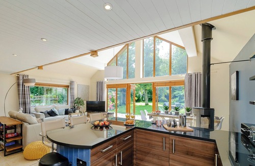 Living area: 49" Smart TV, Sky, Ipod Dock, Amazon Echo, Woodburner, Patio Doors Leading To Garden