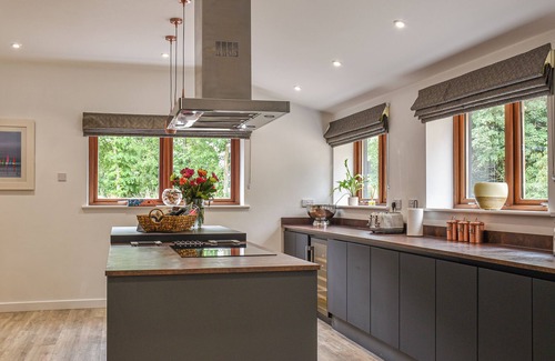 Separate Toilet.. Underfloor central heating, electricity, bed linen, towels and Wi-Fi included. Welcome pack. Front garden with patio, sitting-out area, garden furniture and BBQ (gas). Hot tub for 6 (private). Private parking for 8 cars. 2 dogs welcome, to be kept on leads at all times (pets are not permitted on the furniture and must be supervised at all times). No smoking. Please note: 2 There are steps in the garden and a small fenced pond.. From the moment you open the large front doors of Dodds Barn you’ll be impressed. Firstly, the vaulted ceiling in the open plan living and dining area will immerse you in a feeling of light and space. Secondly, the quality of the fixtures, fittings and burst of colour. This is just the start, and it gets better…