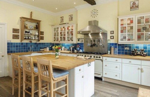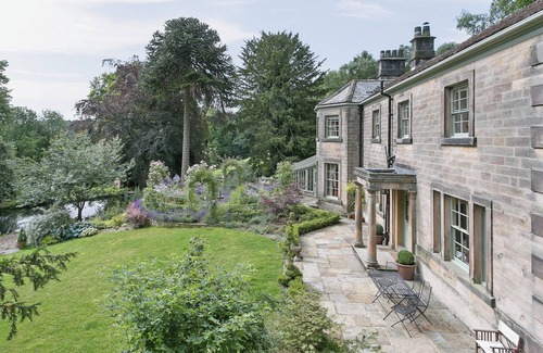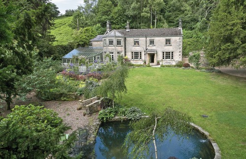 Bathroom: Roll Top Bath, Toilet. Gas central heating, electric underfloor heating (in kitchen), electricity, bed linen, towels and Wi-Fi included. Initial fuel for wood burners included. Travel cot and highchair available on request. Welcome pack. Large, enclosed lawned garden with decked terrace, patio and garden furniture. Landscaped grounds. Bike store. Private parking. No smoking. Please note: There is a water feature in the orangery, and an unfenced pond in the grounds.. Lumsdale House was built by the local mill owner in 1970 in the National Heritage listed conservation area in the heart of the Lumsdale Valley. It lies on the edge of Matlock, which is full of historical interest and natural beauty. Approached by electric gates and a gravelled driveway leading to a large turning circle, this beautiful detached property enjoys views over stunning landscaped gardens, with large ponds and various seating areas. The garden has its Joseph Paxton trademark features and has been given a whole new lease of life by the owner who is a botanical garden designer. There are various seating and dining areas and a sweeping lawn leading to a top pond which cascades into the main pond with views towards Tansley. The property itself is entered by a spacious reception hall with its original mouldings, ceiling rose, coving and oak-clad pillars either side. Guests have the choice of a drawing room or living room which has a wood burner in the original stone fireplace and French doors to both sides, one leading to the enclosed decking area and another set into the fabulous orangery. The orangery boasts a York flagstone floor with olive trees, a water feature, original vines and a stove, and makes a perfect place in which to enjoy a relaxing evening drink.